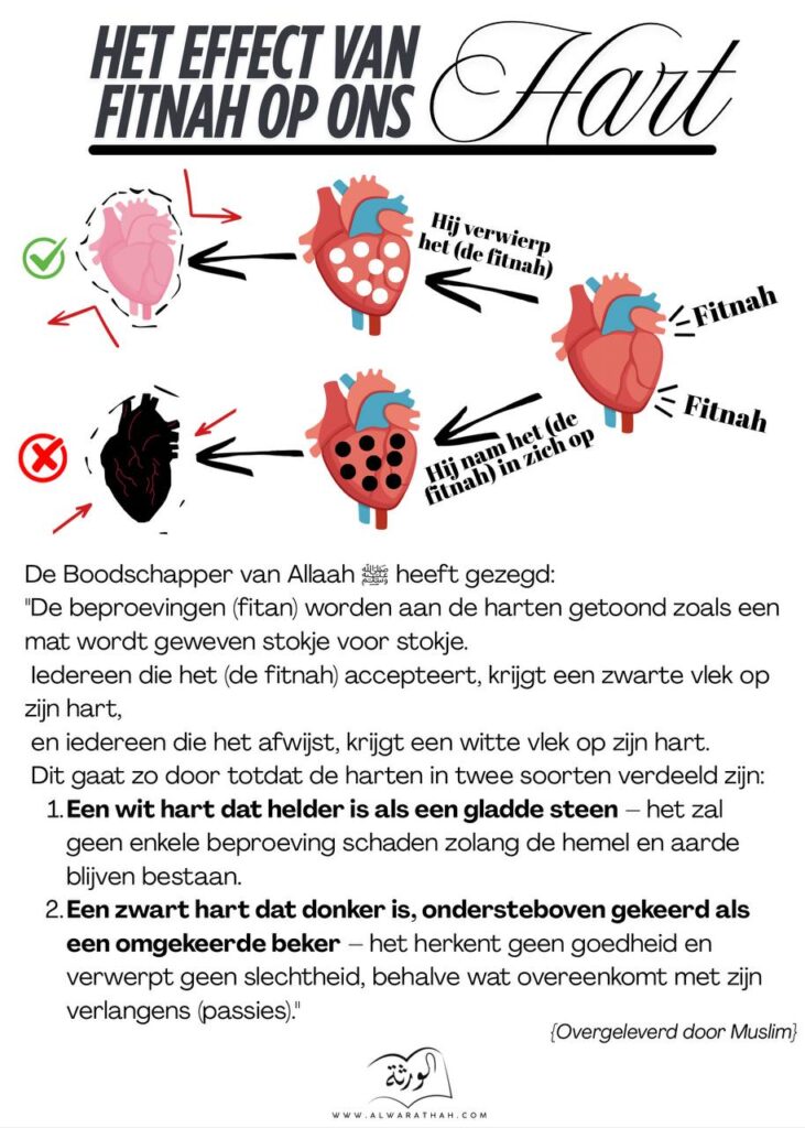 Wanneer je de fitnah echter afwijst en er afstand van neemt, krijgt het hart telkens een wit stipje.